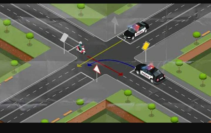 Posle njega prolazi drugo policijski automobil, pošto kao vozilo pod rotacijom ima pravo prvenstva u odnosu na skuter (bez obzira na to što se skuter kreće saobraćajnicom sa pravom prvenstva prolaza). Poslednji kroz raskrsnicu prolazi skuter.