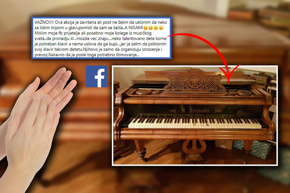 – Molim moje Fb prijatelje, ali posebno moje kolege iz muzičkog sveta da pronađu ili možda vec znaju neko talentovano dete kome je potreban klavir, a nema uslova da ga kupi. Ja želim da poklonim svoj klavir takvom detetu. Njihovo je samo da organizuju iznošenje i prevoz. Naravno da je posle toga potrebno štimovanje, napisala je ona.