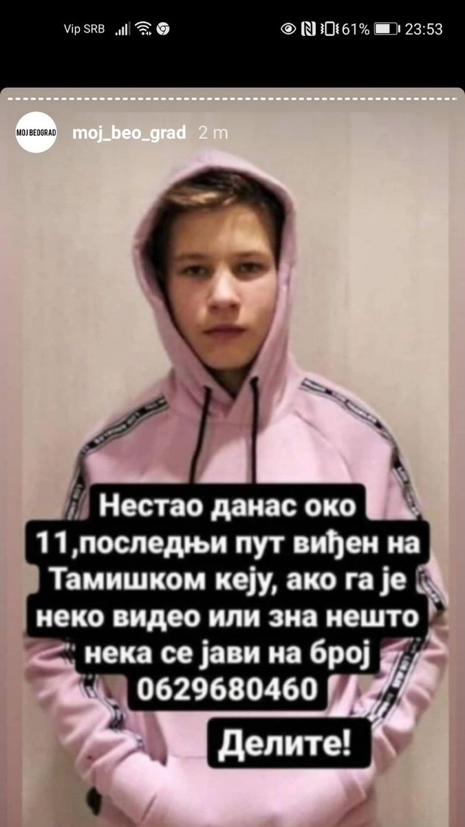 – Nestanak je prijavljen policiji, potraga je u toku – kazala je ona i dodala su ga tražili čitav dan, kao i da se dečak potresao zbog raskida sa devojkom, te da se čak i oprostio od drugarice.