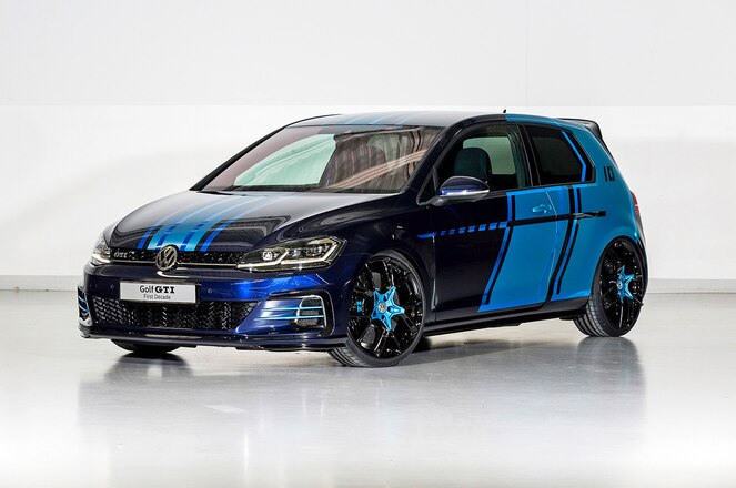The GTI First Decade sports Atlantic Blue Metallic paint with large areas on the doors and side panels using foil painted in Satin Ocean Shimmer. Stripes of glossy blue chrome foil can be seen throughout the paintwork, and the hood and roof receive racing stripes in three contrasting blue foils. The 20-inch black mb-Design wheels have hubs painted in Ocean Shimmer while the honeycomb radiator grille receives a black high-gloss paint job. Being the 10th Wrthersee show car since 2008, the number 10 can be seen on the C-pillars along with a First Decade logo on the tailgate.