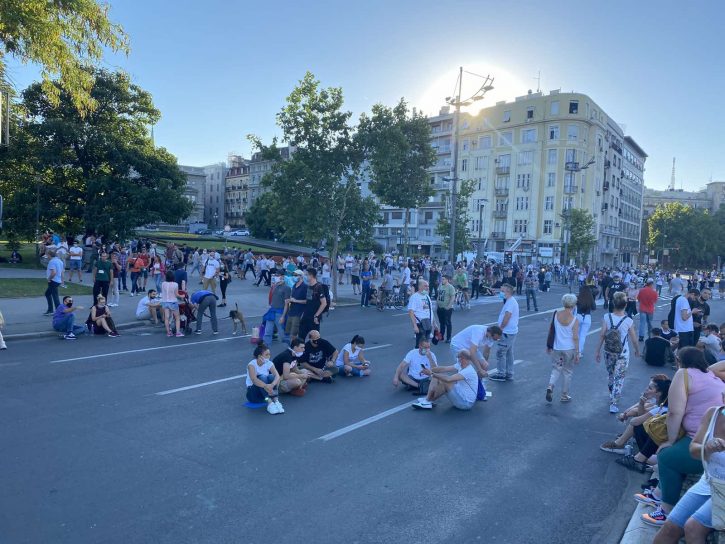 19.16 – Plato ispred Skupštine se puni. Građani sede na ulici i u parku, duvaju u pištaljke i tapšu. Mogu se videti transparenti: “Ne nasedaj, sedi”