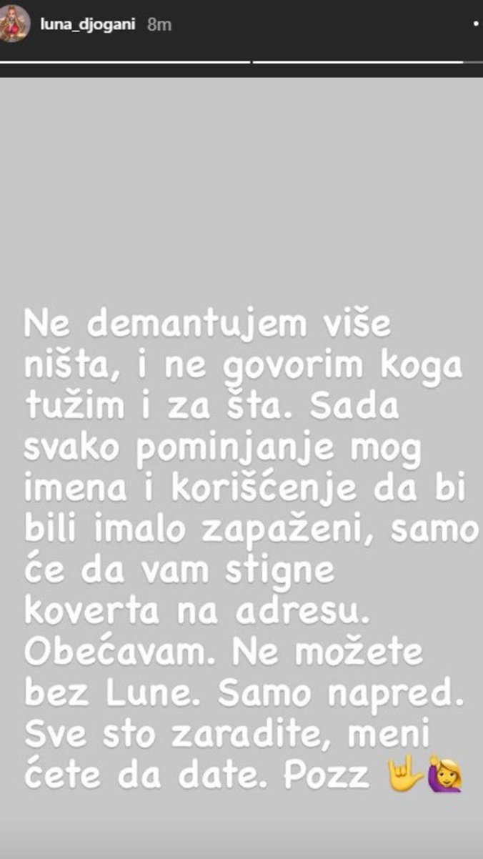 Ne dematujem više ništa i ne govorim koga tužim i za šta. Sada svako pominjanje mog imena i korišćenje da bi bili malo zapaženi, samo će da vam stigne koverta na adresu. Obećavam. Ne možete bez Lune. Samo napred. Sve što zaradite, meni ćete da date – napisala je Luna na Instagramu.