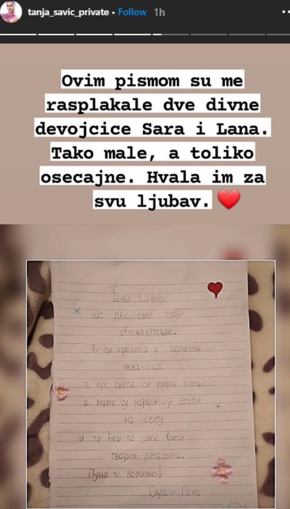 “Tanja Savić, nas dve smo tvoje obožavateljke. Ti si prelepa i odlična pevačica, a pre svega si divna mama, a mame su najvažnije osobe na svetu i ti ćeš to uvek biti tvojim dečacima. Volimo te puno! Sara i Lana”, piše u pismu koje je pevačica dobila.