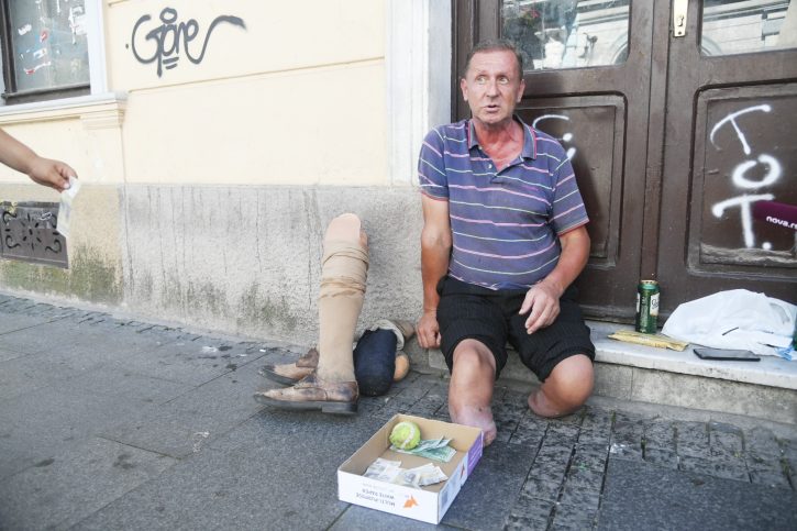 “Užas, i sami vidite. Užas je kad morate ovo da radite”, priča nam dok ispred njega stoji kutija u koju prolaznici ubacuju koliko ko može – 10. 20, 50, 100… dinara.