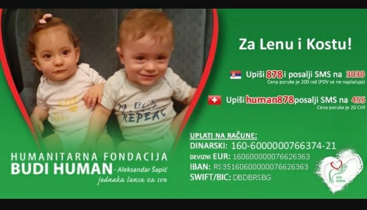 S obzirom na to da i Lena i Kosta vidno zaostaju za svojim vršnjacima i neophodna im je kontinuirana fizikalna terapija, radna terapija, hidroterapija, taktilna i senzorna stimulacija i banjsko lečenje. Uz to, potrebni su im tretmani sa logopedom, defektologom, somatopedom, psihologom i dečijim psihijatrom; specijalistički i kontrolni pregledi, suplementi medicinski potrošni materijal i medicinska pomagala. Predstoje im i hirurške intervencije oftamologa, neurohirurga i ortopeda. Samo lečenje i nega iziskuju dosta sredstava.