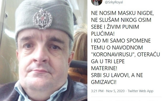 Namerno odbijanje da se nosi maska i pozivanje na mit o nebeskom narodu je opasno i za pojedinca, ali i za okolinu. Iza se krije mnogo više problema nego što ovaj Tviter status prikazuje.