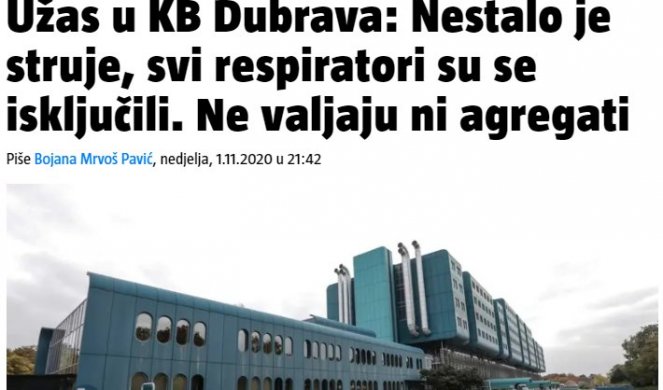 Deo bolnice u KBC Dubrava u Zagrebu ostao je danas u jednom trenutku bez struje, a respiratori su morali da se pokreću, mehanički, ručno, piše hrvatski portal 24 sata