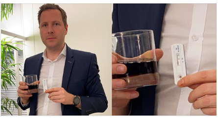 On je za govornicom obavio brzi antigenski test nad Coca-Colom. Nakapao je kap soka na korona test, a rezultat je bio pozitivan.