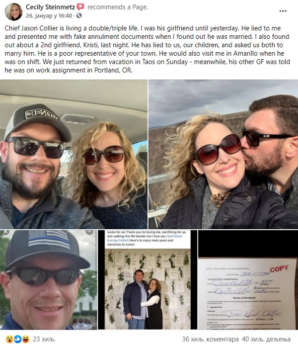 “Šef policije Džejson Kolijer živi dvostrukim/trostrukim životom. Do juče sam bila njegova devojka. Takođe sam saznala za njegovu drugu devojku Kristi sinoć. Sve nas je lagao, našu decu, čak nas je obe pitao da se udamo za njega”, napisala je Štajnmec na Fejsbuku, a njena objava ubrzo se proširila društvenom mrežom.