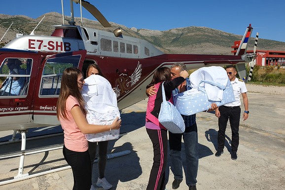 Stajići su u Trebinje iz UKC Banjaluka u subotu poslepodne stigli helikopterom Helikopterskog servisa RS, a majka Marija u naručju je donela svoja dva čeda.