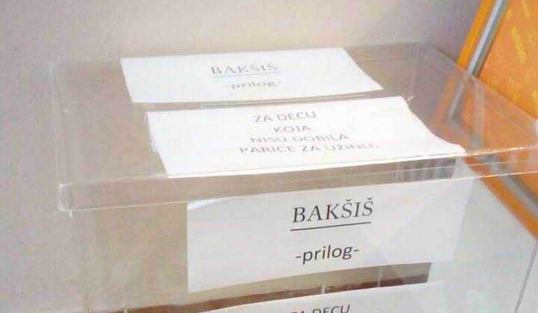 U jednoj pekari u Novim Banovcima, u blizini Osnovne škole „Nikola Tesla“, stoji providna kutija puna para. A na kutiji zanimljiv natpis: „Bakšiš prilog za decu koja nisu dobila parice za užinu. Deco, tražite slobodno. Parice u kutiji su sa vašu užinu.“