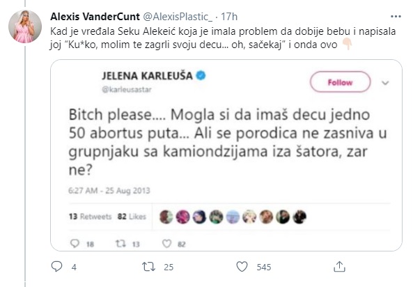 “Mogla si da imaš decu jedno 50 abortus puta, ali se porodica ne zasniva u grupnjaku sa kamiondžijama iza šatora, zar ne? Takođe, Karleuša je prozvala i Zorannah, i to kada je influenserki umrla majka!